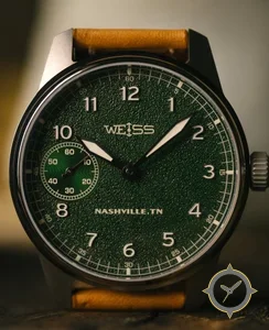 Eine Pilot-Uhr mit einem 36.5mm Gehäuse im Vintage-Stil gefertigt aus Edelstahl mit einem Zifferblatt in grün und einer besonderen "heavily grained / sandpaper-like texture"-Oberfläche.