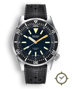 Eine Taucheruhr-Uhr mit einem markanten 50mm Auftritt am Handgelenk, gefertigt aus Edelstahl mit einem Zifferblatt in marineblau und einer besonderen "matte"-Oberfläche.
