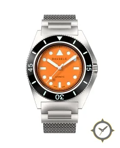 Eine Taucheruhr-Uhr mit einem vielseitigen 38.5mm Gehäuse, das an fast jedes Handgelenk passt, gefertigt aus Edelstahl mit einem Zifferblatt in orange und einer besonderen "lacquer"-Oberfläche.