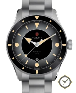 Eine Taucheruhr-Uhr mit einem 36.5mm Gehäuse im Vintage-Stil gefertigt aus Edelstahl mit einem Zifferblatt in schwarz und einer besonderen "radial gradient / sunburst"-Oberfläche.