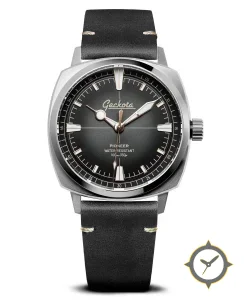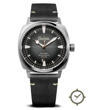 Eine Vintage-Uhr mit einem 34mm Gehäuse im Vintage-Stil gefertigt aus Edelstahl mit einem Zifferblatt in grau und einer besonderen "sunburst"-Oberfläche.