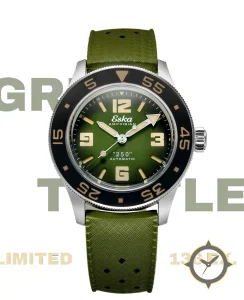 Eine Taucheruhr-Uhr mit einem 30.5mm Gehäuse im Vintage-Stil gefertigt aus Edelstahl mit einem Zifferblatt in grün und einer besonderen "sunburst/ombré gradient"-Oberfläche.