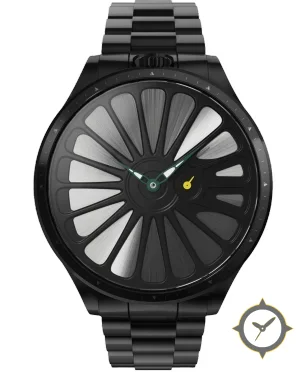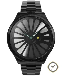 Eine Minimalistisch-Uhr mit einem markanten 48mm Auftritt am Handgelenk, gefertigt aus Edelstahl mit einem Zifferblatt in schwarz und einer besonderen "sunburst / radial brushed turbine-style segments"-Oberfläche.