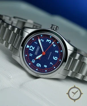 Eine Field-Uhr mit einem 37mm Gehäuse im Vintage-Stil gefertigt aus Edelstahl mit einem Zifferblatt in blau und einer besonderen "granular / grained (textured)"-Oberfläche.