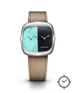 Eine GMT-Uhr mit einem 21mm Gehäuse im Vintage-Stil gefertigt aus Edelstahl mit einem Zifferblatt in türkis und einer besonderen "semi-precious stone (turquoise and black onyx)"-Oberfläche und einer echten GMT-Funktion, mit der du eine zweite Zeitzone verfolgen kannst.