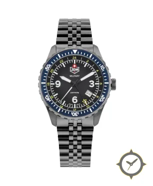 Eine Militär-Uhr mit einem vielseitigen 41mm Gehäuse, das an fast jedes Handgelenk passt, gefertigt aus Edelstahl mit einem Zifferblatt in schwarz und einer besonderen "matte"-Oberfläche.