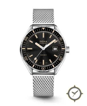 Eine Taucheruhr-Uhr mit einem markanten 48.5mm Auftritt am Handgelenk, gefertigt aus Edelstahl mit einem Zifferblatt in schwarz und einer besonderen "sunburst"-Oberfläche.