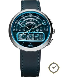 Eine Chronograph-Uhr mit einem vielseitigen 38.5mm Gehäuse, das an fast jedes Handgelenk passt, gefertigt aus Edelstahl mit einem Zifferblatt in blau und einer besonderen "sunburst / concentric rings"-Oberfläche.