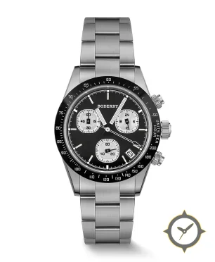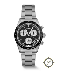 Eine Chronograph-Uhr mit einem markanten 45mm Auftritt am Handgelenk, gefertigt aus Edelstahl mit einem Zifferblatt in schwarz und einer besonderen "matte"-Oberfläche.