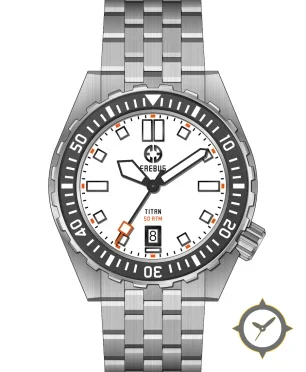 Eine Taucheruhr-Uhr mit einem vielseitigen 38.5mm Gehäuse, das an fast jedes Handgelenk passt, gefertigt aus Edelstahl mit einem Zifferblatt in weiß und einer besonderen "matte"-Oberfläche.
