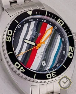 Eine Taucheruhr-Uhr mit einem markanten 48mm Auftritt am Handgelenk, gefertigt aus Edelstahl mit einem Zifferblatt in weiß und einer besonderen "painted, multicolored brushstroke finish"-Oberfläche.