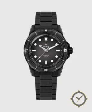 Eine Taucheruhr-Uhr mit einem 34.5mm Gehäuse im Vintage-Stil gefertigt aus Edelstahl mit einem Zifferblatt in schwarz und einer besonderen "matte"-Oberfläche.