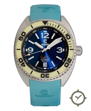 Eine Taucheruhr-Uhr mit einem markanten 46.5mm Auftritt am Handgelenk, gefertigt aus Edelstahl mit einem Zifferblatt in blau und einer besonderen "sunburst finish"-Oberfläche.