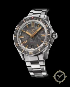 Eine Taucheruhr-Uhr mit einem markanten 45mm Auftritt am Handgelenk, gefertigt aus Edelstahl mit einem Zifferblatt in grau und einer besonderen "forged-carbon / marbled texture"-Oberfläche.