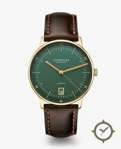 Eine Dress-Uhr mit einem 32mm Gehäuse im Vintage-Stil gefertigt aus Gold mit einem Zifferblatt in grün und einer besonderen "matte"-Oberfläche.