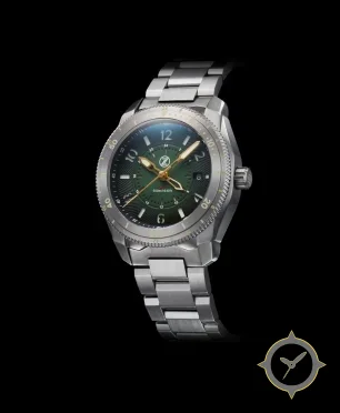 Eine Taucheruhr-Uhr mit einem markanten 47mm Auftritt am Handgelenk, gefertigt aus Edelstahl mit einem Zifferblatt in grün und einer besonderen "radial guilloché / sunburst with wave pattern"-Oberfläche und einer echten GMT-Funktion, mit der du eine zweite Zeitzone verfolgen kannst.