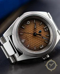 Eine Sport-Uhr mit einem vielseitigen 40.5mm Gehäuse, das an fast jedes Handgelenk passt, gefertigt aus Edelstahl mit einem Zifferblatt in braun und einer besonderen "three-dimensional geometric guilloché (pyramid/hobnail)"-Oberfläche.