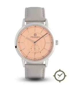 Eine Dress-Uhr mit einem 35mm Gehäuse im Vintage-Stil gefertigt aus Edelstahl mit einem Zifferblatt in orange und einer besonderen "vertical-striped center with matte outer ring"-Oberfläche.