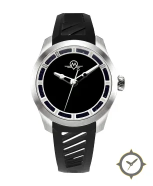 Eine Sport-Uhr mit einem markanten 42mm Auftritt am Handgelenk, gefertigt aus Edelstahl mit einem Zifferblatt in schwarz und einer besonderen "matte black center with aventurine (starry) minute-track ring"-Oberfläche.