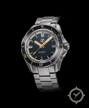 Eine Taucheruhr-Uhr mit einem 34mm Gehäuse im Vintage-Stil gefertigt aus Edelstahl mit einem Zifferblatt in marineblau und einer besonderen "grained matte"-Oberfläche.