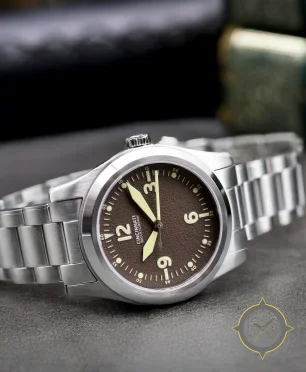 Eine Field-Uhr mit einem 36.5mm Gehäuse im Vintage-Stil gefertigt aus Edelstahl.