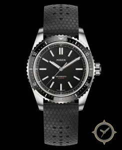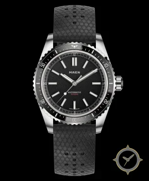 Eine Taucheruhr-Uhr mit einem 36mm Gehäuse im Vintage-Stil gefertigt aus Edelstahl mit einem Zifferblatt in schwarz und einer besonderen "grained / sandblasted texture"-Oberfläche.