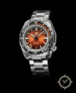 Eine Taucheruhr-Uhr mit einem markanten 50.5mm Auftritt am Handgelenk, gefertigt aus Edelstahl mit einem Zifferblatt in orange und einer besonderen "sunburst"-Oberfläche.