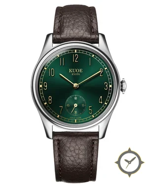 Eine Dress-Uhr mit einem 33mm Gehäuse im Vintage-Stil gefertigt aus Edelstahl mit einem Zifferblatt in grün und einer besonderen "sunburst"-Oberfläche.