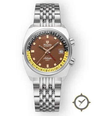Eine GMT-Uhr mit einem 29mm Gehäuse im Vintage-Stil gefertigt aus Edelstahl mit einem Zifferblatt in braun und einer besonderen "sunburst"-Oberfläche und einer echten GMT-Funktion, mit der du eine zweite Zeitzone verfolgen kannst.