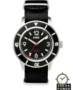 Eine Taucheruhr-Uhr mit einem 36.5mm Gehäuse im Vintage-Stil gefertigt aus Edelstahl mit einem Zifferblatt in schwarz und einer besonderen "matte"-Oberfläche.