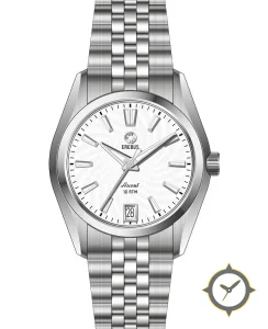 Eine Dress-Uhr mit einem 34mm Gehäuse im Vintage-Stil gefertigt aus Edelstahl mit einem Zifferblatt in weiß und einer besonderen "radial guilloche"-Oberfläche.