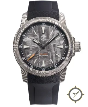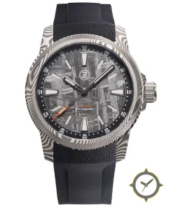 Eine Taucheruhr-Uhr mit einem markanten 44mm Auftritt am Handgelenk, gefertigt aus Edelstahl mit einem Zifferblatt in grau und einer besonderen "meteorite / Widmanstätten texture"-Oberfläche.