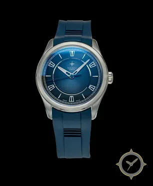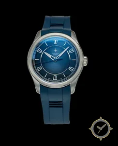 Eine Dress-Uhr mit einem markanten 46mm Auftritt am Handgelenk, gefertigt aus Edelstahl mit einem Zifferblatt in blau und einer besonderen "sunburst"-Oberfläche.
