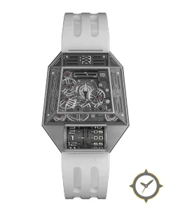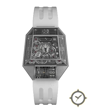 Eine Skelett-Uhr mit einem vielseitigen 38mm Gehäuse, das an fast jedes Handgelenk passt, gefertigt aus Edelstahl mit einem Zifferblatt in grau und einer besonderen "open-worked (skeletonized, exposed movement)"-Oberfläche.