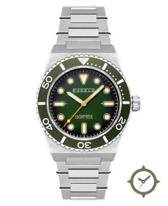 Eine Taucheruhr-Uhr mit einem 37.5mm Gehäuse im Vintage-Stil gefertigt aus Edelstahl mit einem Zifferblatt in grün und einer besonderen "sunburst/gradient"-Oberfläche.