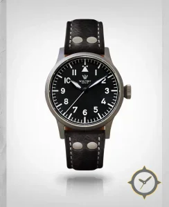 Eine Pilot-Uhr mit einem markanten 45.5mm Auftritt am Handgelenk, gefertigt aus Edelstahl mit einem Zifferblatt in schwarz und einer besonderen "matte"-Oberfläche.