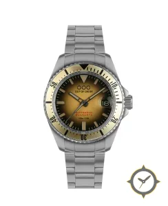 Eine Taucheruhr-Uhr mit einem 34.5mm Gehäuse im Vintage-Stil gefertigt aus Edelstahl mit einem Zifferblatt in braun und einer besonderen "fumé / sunburst gradient"-Oberfläche.