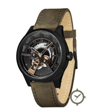 Eine Skelett-Uhr mit einem vielseitigen 39mm Gehäuse, das an fast jedes Handgelenk passt, gefertigt aus Edelstahl mit einem Zifferblatt in schwarz und einer besonderen "skeletonized, multi-layer matte and brushed finishes"-Oberfläche.