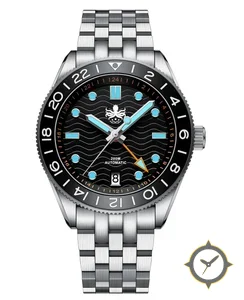 Eine GMT-Uhr mit einem 35mm Gehäuse im Vintage-Stil gefertigt aus Edelstahl mit einem Zifferblatt in schwarz und einer besonderen "wavy"-Oberfläche und einer echten GMT-Funktion, mit der du eine zweite Zeitzone verfolgen kannst.