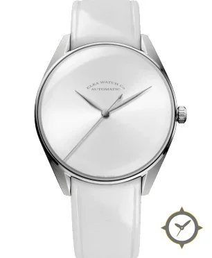 Eine Minimalistisch-Uhr mit einem markanten 45mm Auftritt am Handgelenk, gefertigt aus Edelstahl mit einem Zifferblatt in weiß und einer besonderen "lacquer"-Oberfläche.