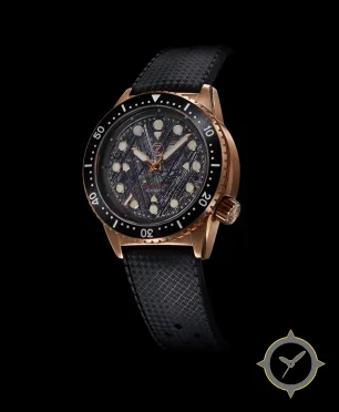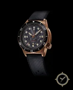 Eine Taucheruhr-Uhr mit einem markanten 49mm Auftritt am Handgelenk, gefertigt aus Bronze mit einem Zifferblatt in grau und einer besonderen "meteorite (Widmanstätten) texture"-Oberfläche.