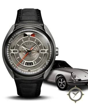 Eine Fahrer-Uhr mit einem markanten 43.5mm Auftritt am Handgelenk, gefertigt aus Edelstahl mit einem Zifferblatt in grau und einer besonderen "brushed metal with a grained finish"-Oberfläche.