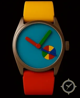 Eine Minimalistisch-Uhr mit einem 34mm Gehäuse im Vintage-Stil gefertigt aus Bronze mit einem Zifferblatt in türkis und einer besonderen "matte"-Oberfläche.