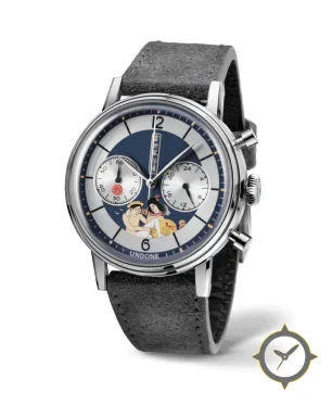 Eine Vintage-Uhr mit einem 32mm Gehäuse im Vintage-Stil gefertigt aus Edelstahl mit einem Zifferblatt in blau und einer besonderen "matte"-Oberfläche.