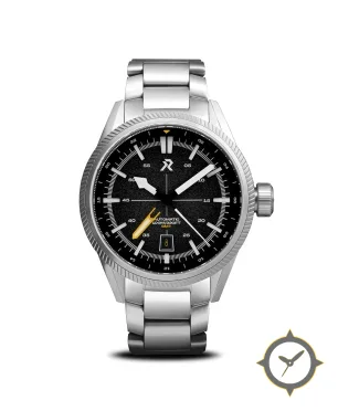 Eine GMT-Uhr mit einem vielseitigen 41mm Gehäuse, das an fast jedes Handgelenk passt, gefertigt aus Edelstahl mit einem Zifferblatt in schwarz und einer besonderen "textured/grain (sandblasted)"-Oberfläche und einer echten GMT-Funktion, mit der du eine zweite Zeitzone verfolgen kannst.
