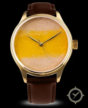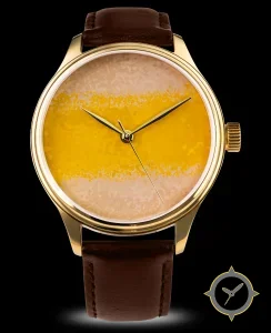 Eine Dress-Uhr mit einem markanten 50mm Auftritt am Handgelenk, gefertigt aus Gold mit einem Zifferblatt in gelb und einer besonderen "enamel, slightly hammered/pebble finish"-Oberfläche.