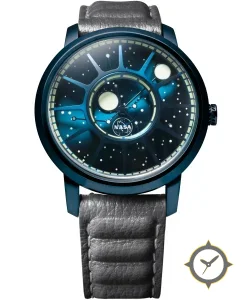 Eine Luftfahrt-Uhr mit einem vielseitigen 38.5mm Gehäuse, das an fast jedes Handgelenk passt, gefertigt aus Edelstahl mit einem Zifferblatt in blau und einer besonderen "sunburst metallic with a starfield effect"-Oberfläche und einer wunderschönen Mondphasenanzeige.