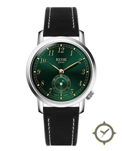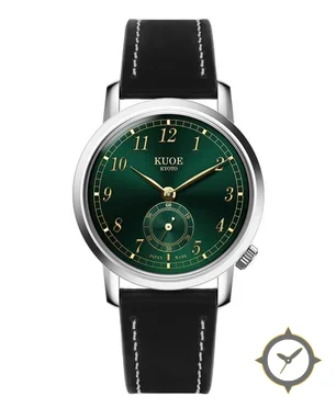 Eine Dress-Uhr mit einem vielseitigen 38mm Gehäuse, das an fast jedes Handgelenk passt, gefertigt aus Edelstahl mit einem Zifferblatt in grün und einer besonderen "sunburst"-Oberfläche.