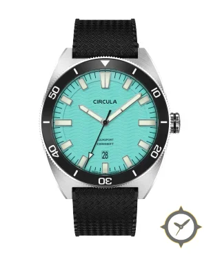 Eine Taucheruhr-Uhr mit einem 37mm Gehäuse im Vintage-Stil gefertigt aus Edelstahl mit einem Zifferblatt in türkis und einer besonderen "embossed wavy texture (wave guilloché)"-Oberfläche.