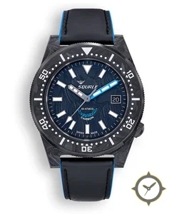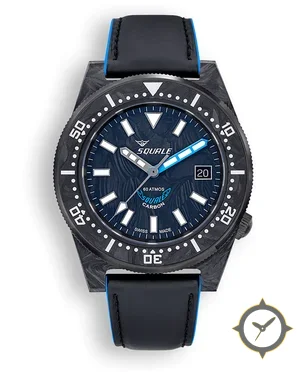Eine Taucheruhr-Uhr mit einem markanten 45.5mm Auftritt am Handgelenk, gefertigt aus Carbon mit einem Zifferblatt in blau und einer besonderen "wavy/marbled"-Oberfläche.